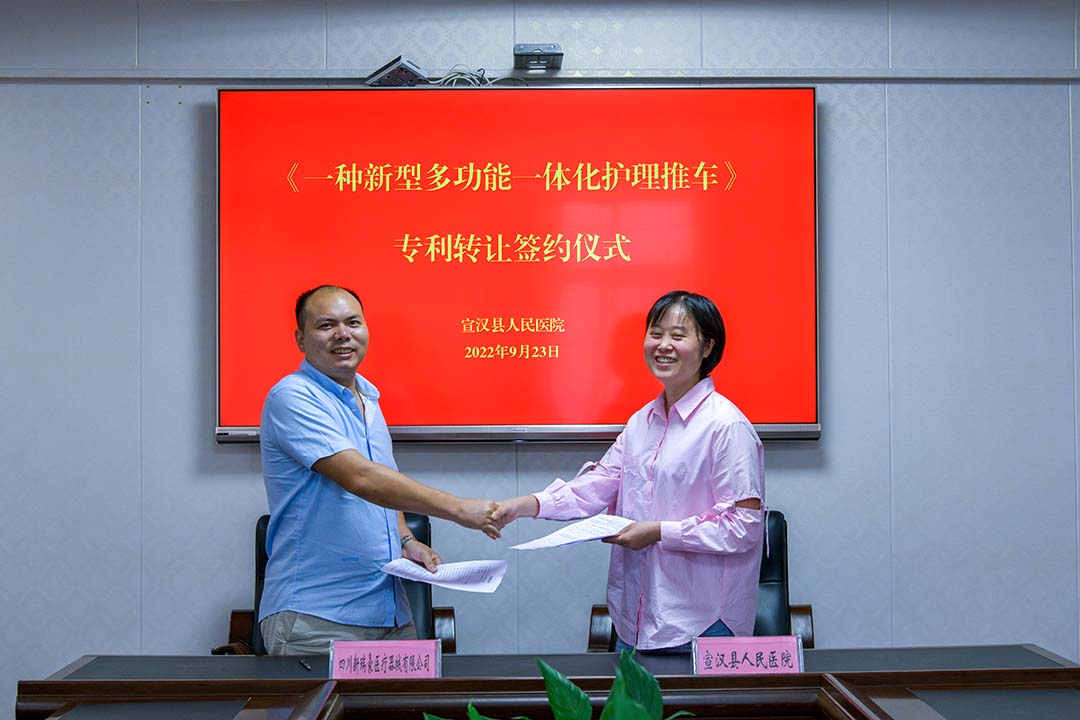 9月23日上午,宣汉人民医院科技创新和成果转化传来好消息——护理部主任陈夏、肝胆外科护士长冉茂梅共同开发的“一种新型多功能一体化移动护理推车”新型专利顺利转化,四川省新瑞豪医疗器械有限公司作为受让方,签订了专利成果转化协议。
