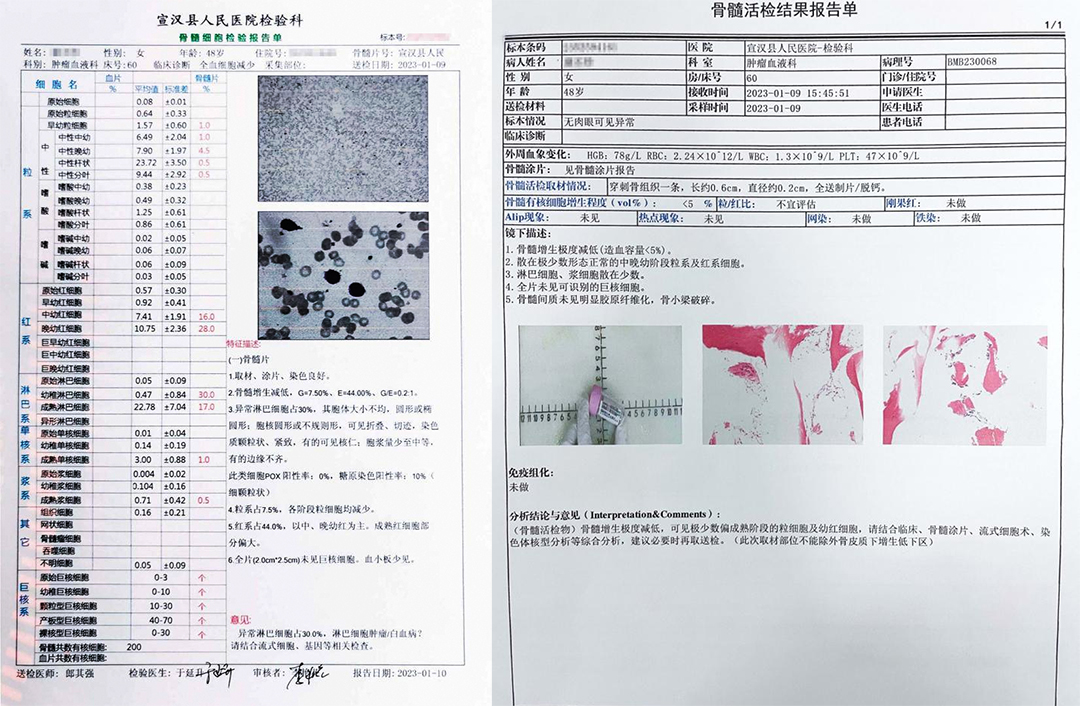 48岁的女性患者康某,因“经期延长10+天,发现全血细胞减少1-天”,于1月6日入住县人民医院肿瘤血液科。门诊血常规提示:白细胞计数1.2×10^9/L,红细胞计数2.30×10^12/L,血红蛋白测定81g/L,血小板计数46×10^9/L,肿瘤血液科汪淑英主任、粟金宏医生组织妇产科、检验科、病理科等MDT团队联合诊疗,依据临床表现、实验室检测结果、骨髓病理活检、免疫学、遗传学及分子生物学等一系列检查结果,确诊为毛细胞白血病。