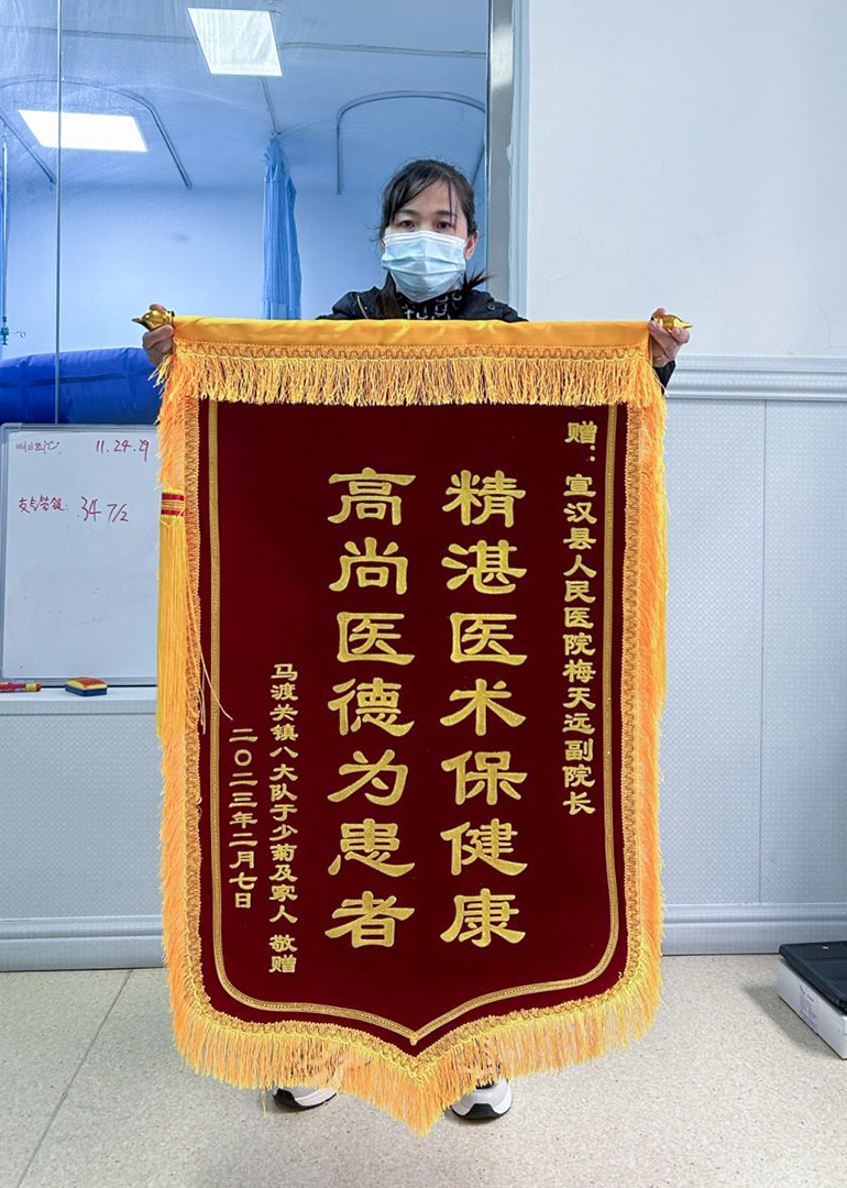 近日,患者于女士家属怀着感恩的心将写有“精湛医术保健康,高尚医德为患者”的锦旗送到了宣汉县人民医院副院长梅天远及呼吸与危重症医学科全体医护人员手中,高度赞扬了医院精湛的医疗技术和细致入微的医疗服务,表达了患者及家属对医护人员的认可和感谢。