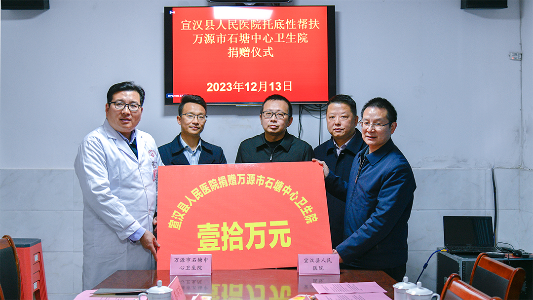 现场举行了爱心捐赠仪式。宣汉县人民医院捐赠万源市石塘镇中心卫生院现金10万元,用于该院购买治疗车、心电监护仪、尿液分析仪、低频治疗仪、中频治疗仪、特定电磁波治疗器、中药熏蒸机、理疗床、ABS单摇病床、电动颈椎牵引、超声波治疗仪等医疗设备。