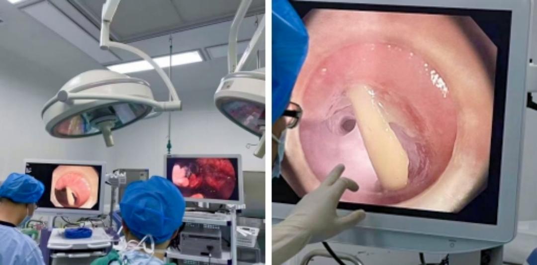 因患者病情危重,手术难度大,宣汉县人民医院胸心外科专业、消化内镜中心、手术麻醉科团队等多学科进行联合会诊后认为,单纯胸腔镜取出异物或单纯胃镜取出异物风险较大,有造成二次损伤和左肺动脉及降主动脉损伤的可能,决定采取胸腔镜联合电子胃镜取出异物的手术方案。在多学科通力协作下,医务人员通过胸腔镜下分离和保护好左肺动脉及降主动脉在胃镜下成功为该名患者取出食管异物。