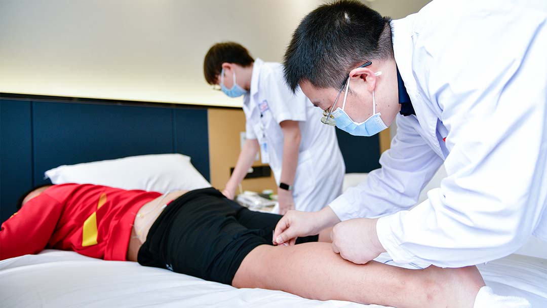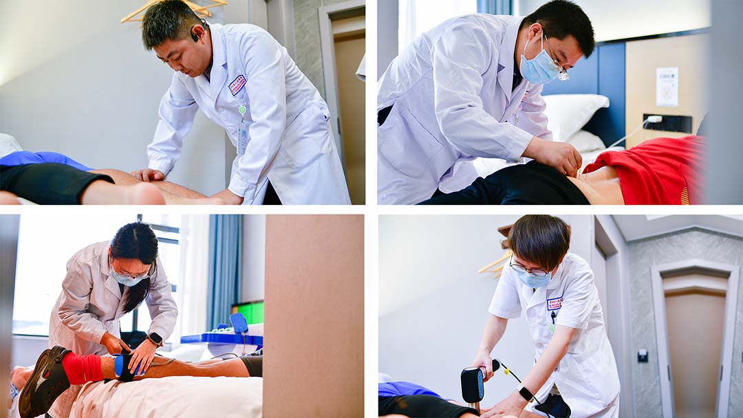 在理疗过程中,医务人员们首先对队员们的身体状况进行了全面了解,包括肌肉力量、关节活动度、柔韧性等方面的评估。根据每位队员的实际情况为他们量身定制了个性化的理疗方案。对于肌肉紧张、疲劳的队员,医务人员采用推拿、按摩等手法,帮助他们放松肌肉,缓解疲劳;对于关节活动受限的队员,则通过针灸等中医传统疗法,缓解运动后的酸痛感。此外,医务人员还引入了现代康复技术,如温热中低频治疗仪、深层肌肉放松仪、电针等,与中医传统疗法相结合,为队员们提供更加全面、有效的理疗服务。温热中低频治疗仪可以刺激肌肉收缩,帮助队员缓解疼痛,维持恢复肌肉力量;深层肌肉放松仪则可以放松肌肉,促进血液循环,缓解肌肉酸痛,快速冲击欲锻炼的肌肉群,增加肌肉温度和血流量,有助于预防运动损伤;电针具有调理经络气血、促进神经功能恢复、改善血液循环与代谢、减轻炎症反应等作用。