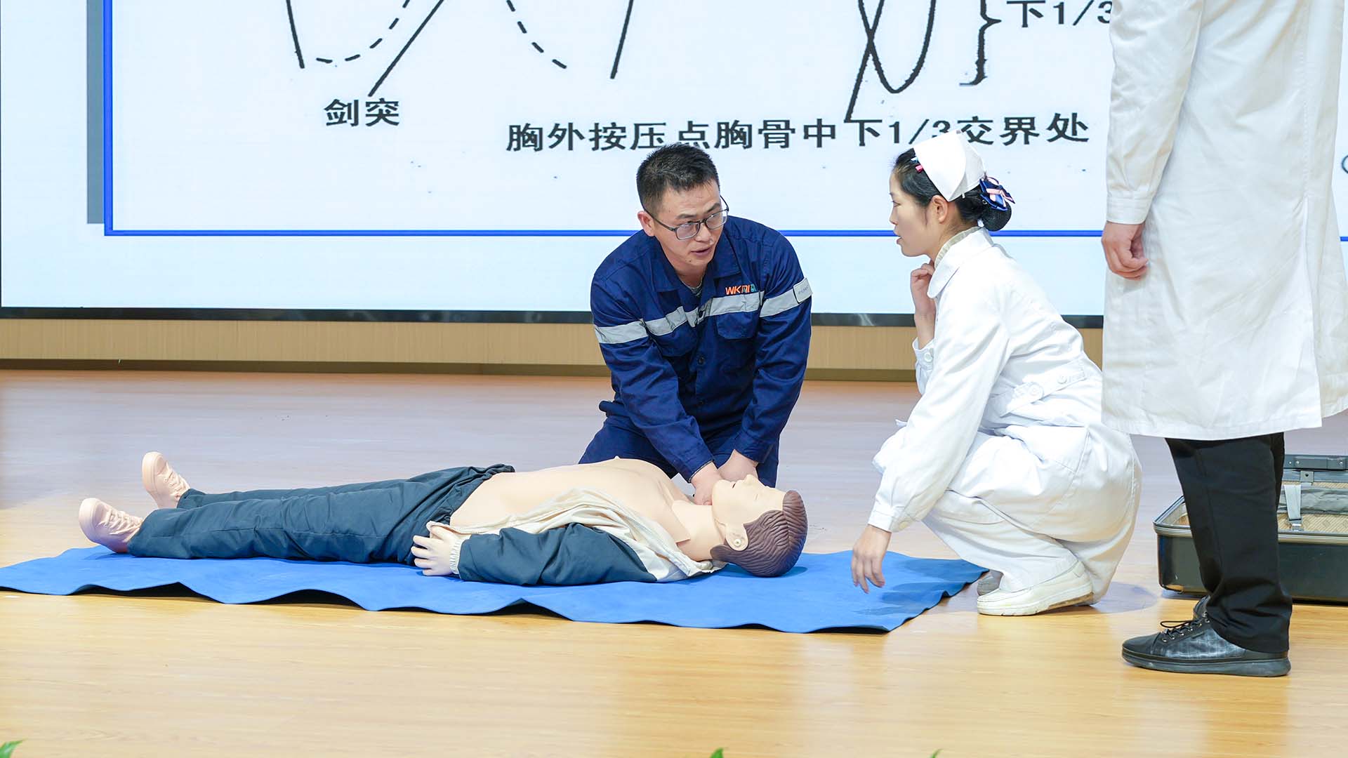 在健康宣教环节,医护专家结合企业职工实际需求,开展系列实用培训。外科党总支部书记李海讲解了“异物卡喉”等突发状况的科学应对方法;门急诊党总支部书记张勇继就久坐引发的颈椎腰椎问题传授防护技巧;外科党总支部副书记张峻松现场演示烧伤应急处理流程;急诊科团队通过“讲解+实操”,系统普及心肺复苏知识,帮助职工掌握关键急救技能。