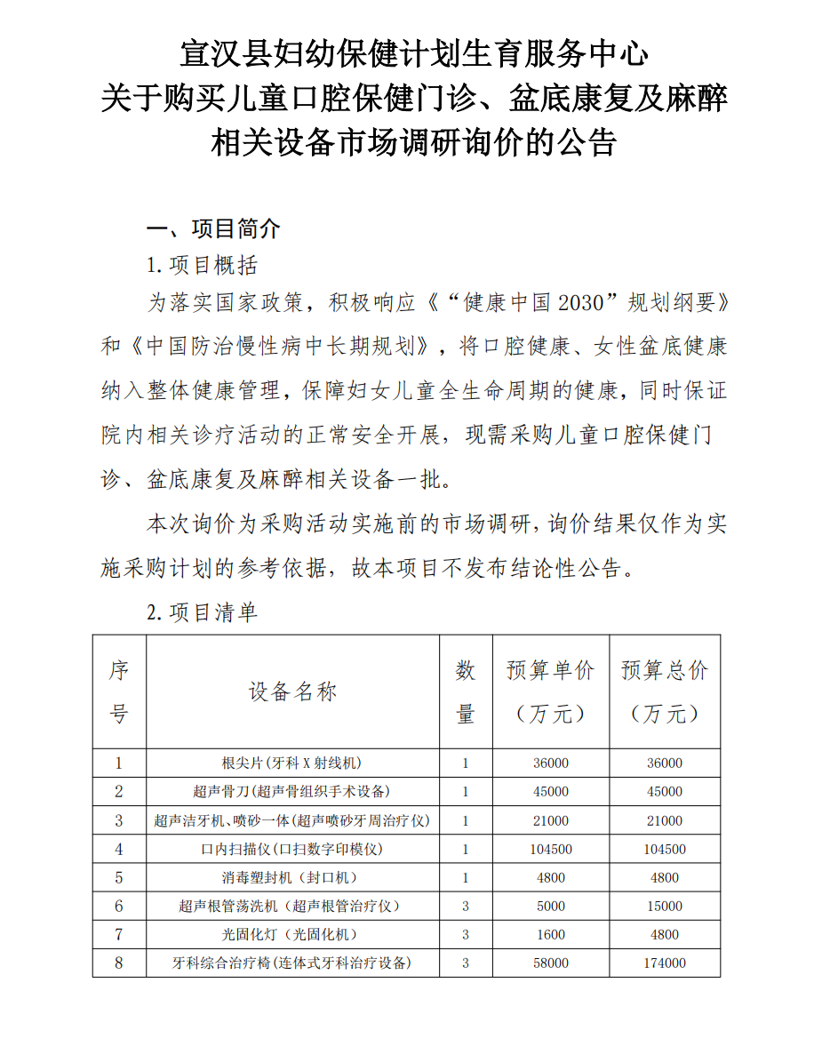 宣汉县妇幼保健计划生育服务中心关于购买儿童口腔保健门诊、盆底康复及麻醉 相关设备市场调研询价的公告