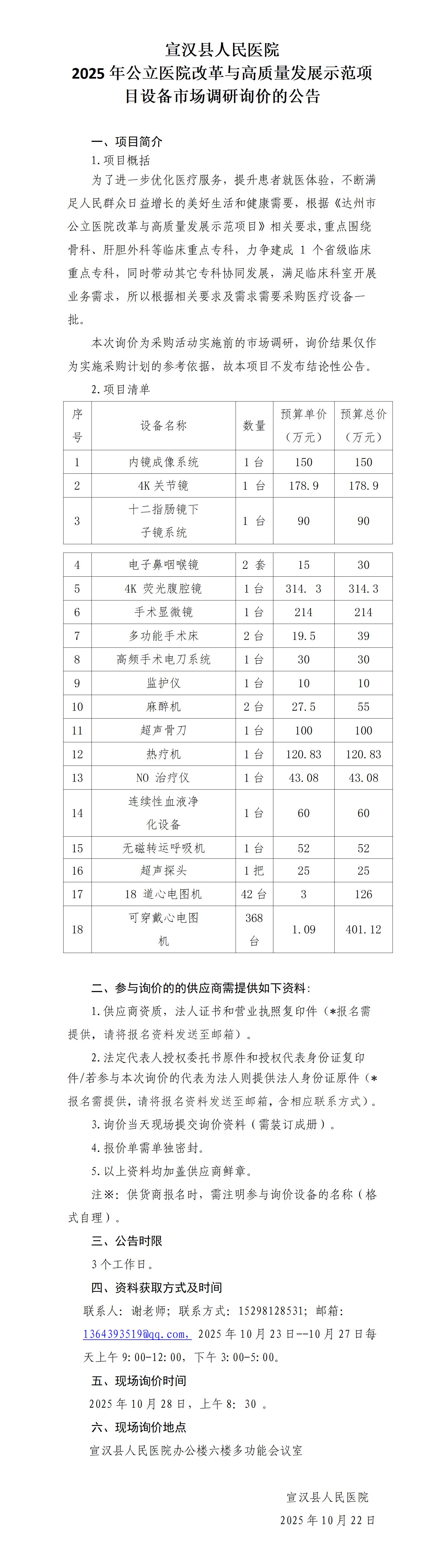 宣汉县人民医院 2025年公立医院改革与高质量发展示范项目设备市场调研询价的公告